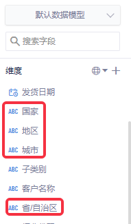 在默认数据模型中,有数据字段如下图所示,有国家、地区、省/自治区、市。需要将其设置为按照地区-省-市的层级关系。