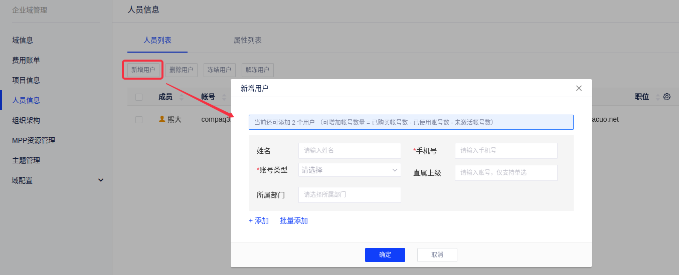 第一步:推荐在“企业域管理-人员信息”界面增加用户,输入用户的姓名、手机号(或邮箱)并设置账号类型;