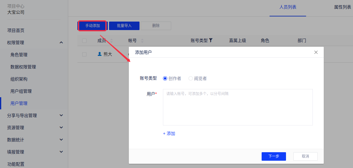 如果人数多,可用弹窗内的批量添加方式导入用户;