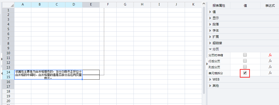 问题描述解决方案问题描述当分页断开正好位于合并格的中间时,两页里都是重复显示断开前的文字。如下图: 实际应用中,我们希望合并单元格里的文字被拆成两部分,分别在两页里显示,而不是两页重复显示。 解决方案选中该合并单元格,勾选右侧属性栏【分页】下的【单元格拆分】,如下图: 效果如下: