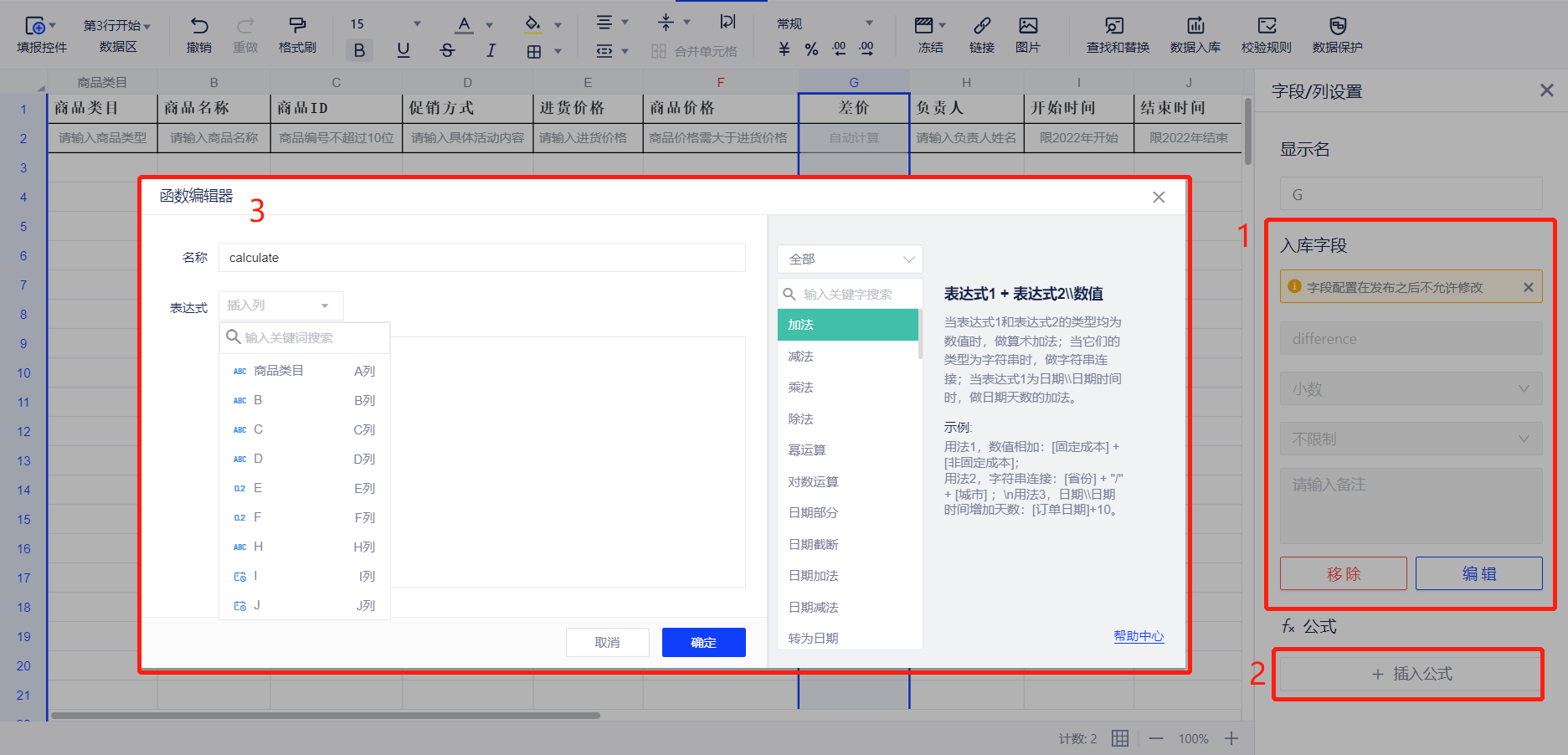 • 当填报控件为公式时,设置入库字段,即可进行函数编辑